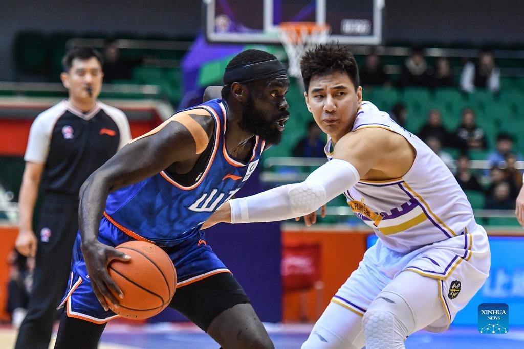 Marial Shayok (L) of Shandong Heroes breaks through during the 48th round match between Shandong Heroes and Beijing Royal Fighters at 2023-2024 season of the Chinese Basketball Association (CBA) league in Jinan, east China's Shandong Province, March 26, 2024. (Xinhua/Zhu Zheng)