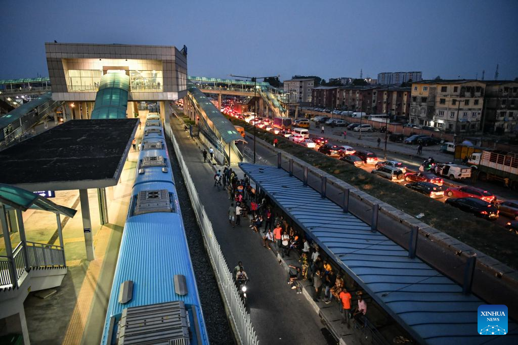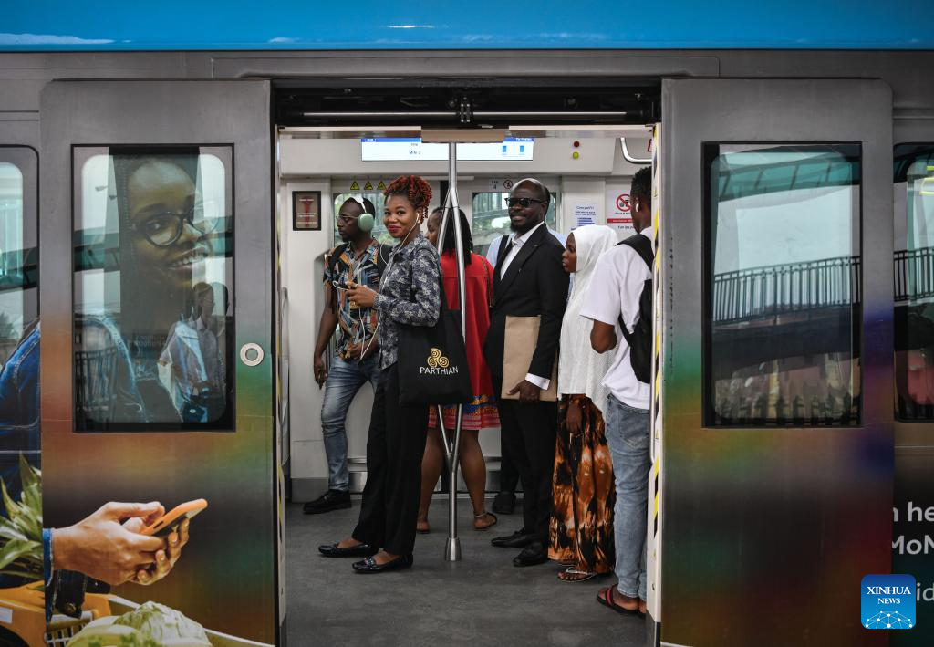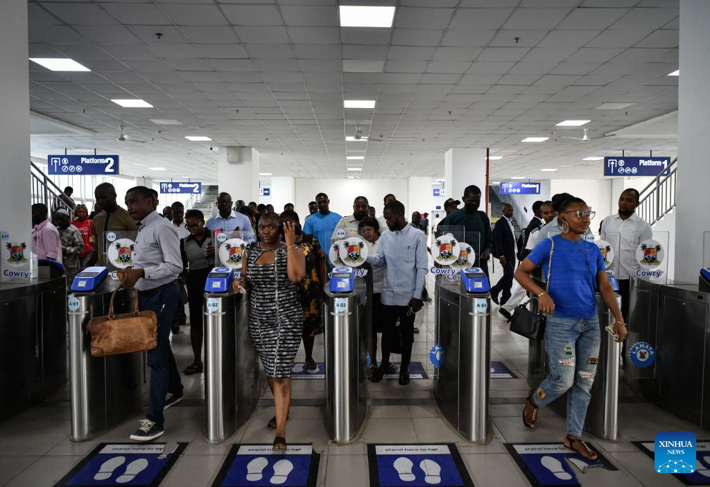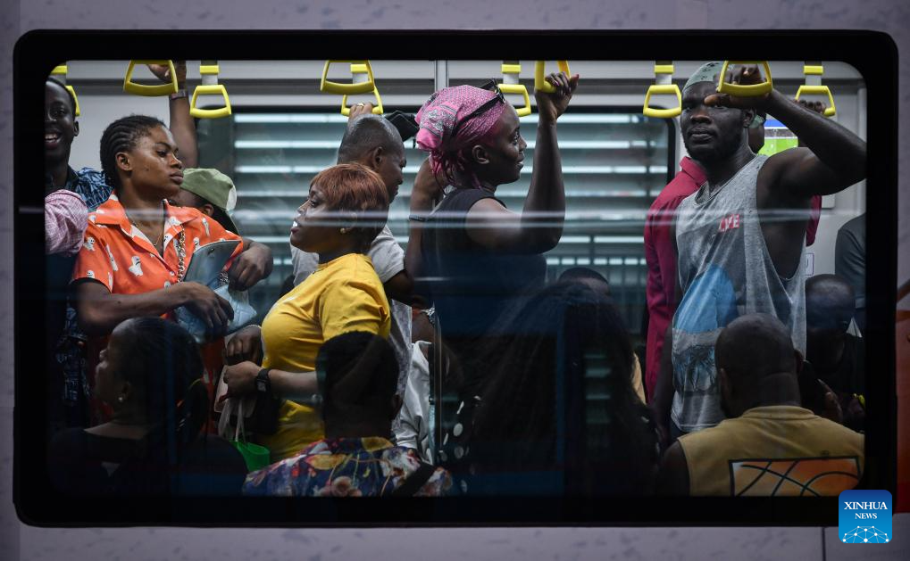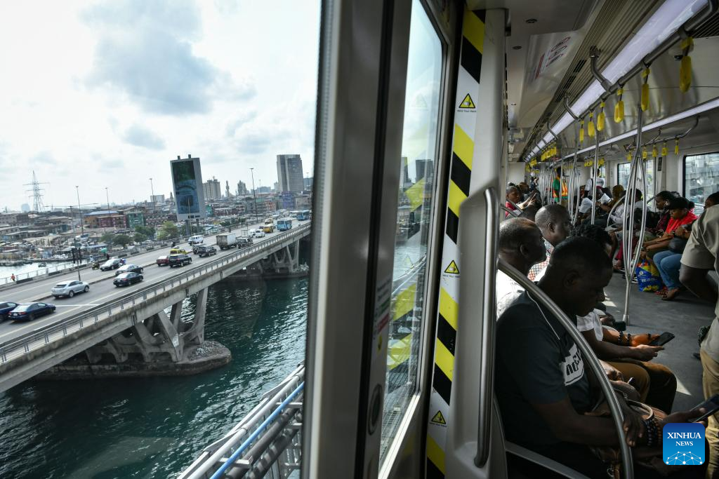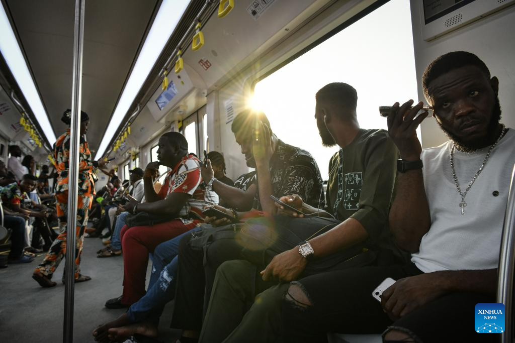 People take a train of the Lagos Rail Mass Transit (LRMT) Blue Line in Lagos, Nigeria, Feb. 28, 2024. Undertaken by China Civil Engineering Construction Corporation (CCECC) in July 2010 and completed in Dec. 2022, the first phase of the Lagos Rail Mass Transit (LRMT) Blue Line corridor spans 13 km and covers five stations. It began commercial operation in Sept. of 2023. As a symbolic project of the Belt and Road Initiative, the Blue Line project is the first electrified railroad and cross-sea light rail project in West Africa. (Xinhua/Han Xu)
