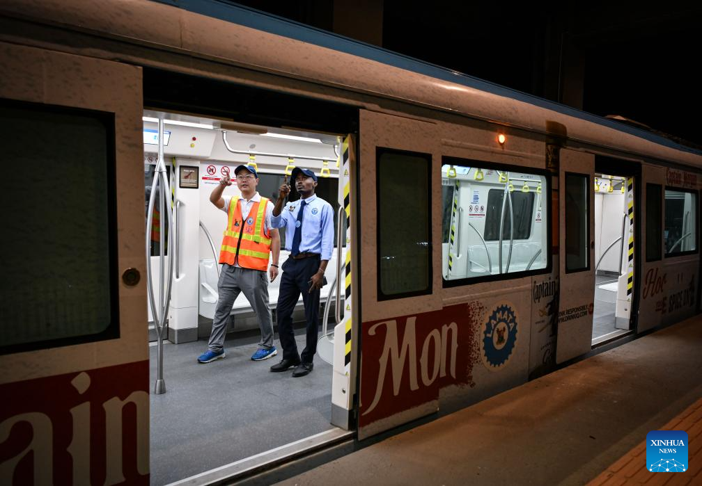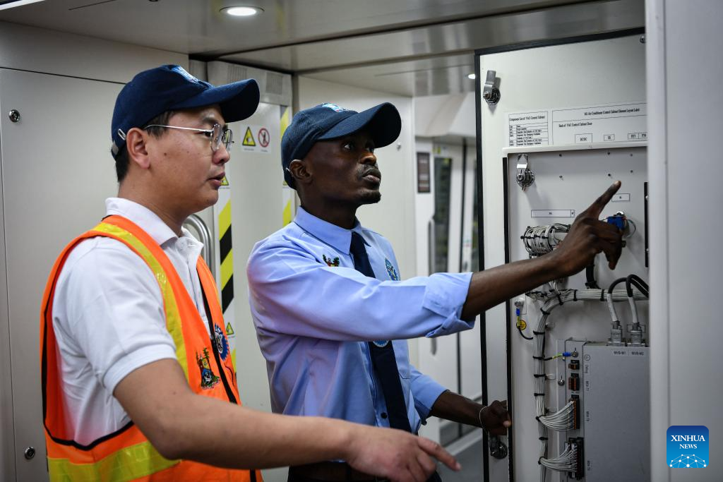 Chinese driver Wang Aofei (L) guides trainee driver Awhangansi to make inspections on a train of the Lagos Rail Mass Transit (LRMT) Blue Line before departure in Lagos, Nigeria, March 3, 2024. Undertaken by China Civil Engineering Construction Corporation (CCECC) in July 2010 and completed in Dec. 2022, the first phase of the Lagos Rail Mass Transit (LRMT) Blue Line corridor spans 13 km and covers five stations. It began commercial operation in Sept. of 2023. As a symbolic project of the Belt and Road Initiative, the Blue Line project is the first electrified railroad and cross-sea light rail project in West Africa. (Xinhua/Han Xu)