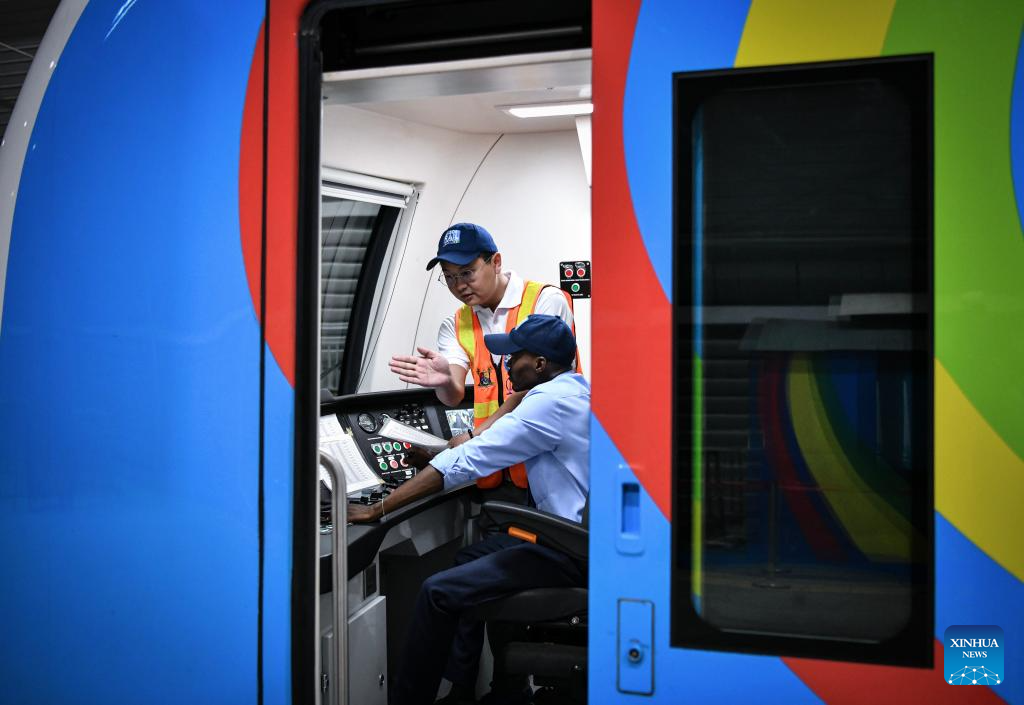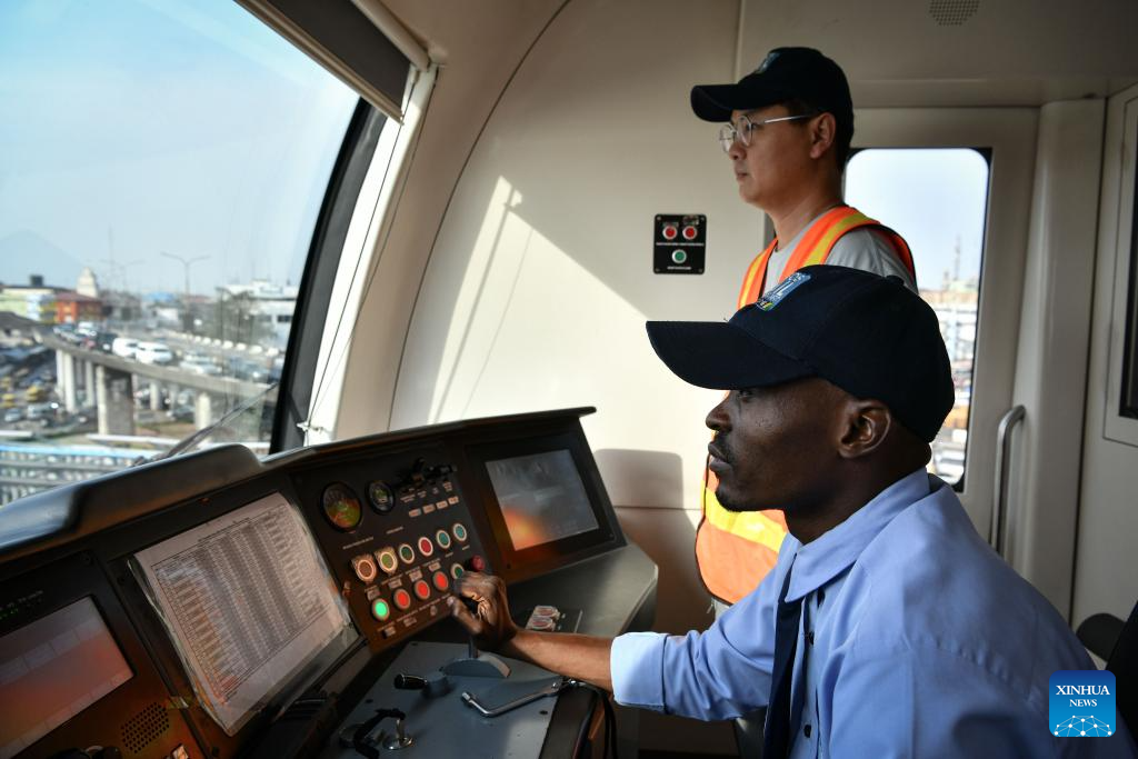 Chinese driver Wang Aofei (rear) and a local driver co-drive a train of the Lagos Rail Mass Transit (LRMT) Blue Line in Lagos, Nigeria, March 2, 2024. Undertaken by China Civil Engineering Construction Corporation (CCECC) in July 2010 and completed in Dec. 2022, the first phase of the Lagos Rail Mass Transit (LRMT) Blue Line corridor spans 13 km and covers five stations. It began commercial operation in Sept. of 2023. As a symbolic project of the Belt and Road Initiative, the Blue Line project is the first electrified railroad and cross-sea light rail project in West Africa. (Xinhua/Han Xu)