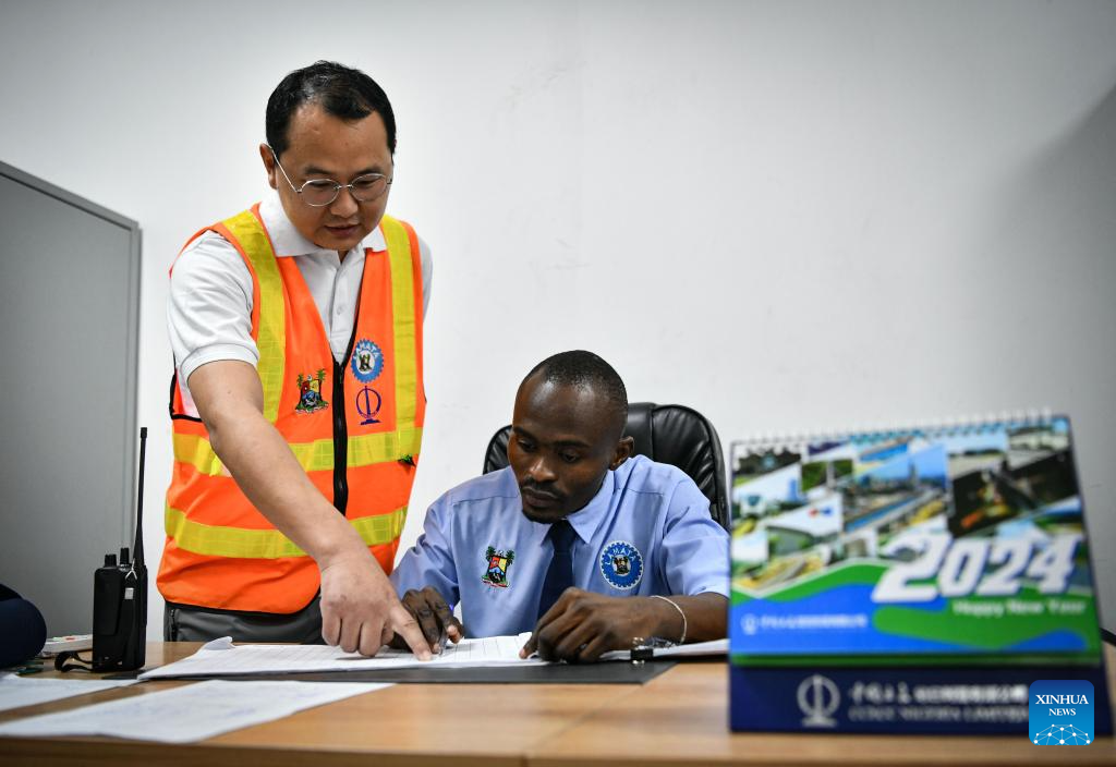 Chinese driver Wang Aofei (L) and trainee driver Awhangansi record data at the dispatch room in Marina Station of the Lagos Rail Mass Transit (LRMT) Blue Line in Lagos, Nigeria, March 3, 2024. Undertaken by China Civil Engineering Construction Corporation (CCECC) in July 2010 and completed in Dec. 2022, the first phase of the Lagos Rail Mass Transit (LRMT) Blue Line corridor spans 13 km and covers five stations. It began commercial operation in Sept. of 2023. As a symbolic project of the Belt and Road Initiative, the Blue Line project is the first electrified railroad and cross-sea light rail project in West Africa. (Xinhua/Han Xu)