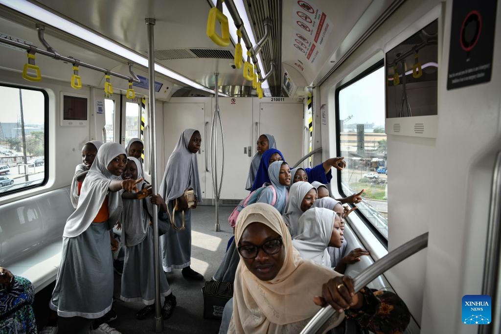 Teachers and students take a train of the Lagos Rail Mass Transit (LRMT) Blue Line in Lagos, Nigeria, Feb. 28, 2024. Undertaken by China Civil Engineering Construction Corporation (CCECC) in July 2010 and completed in Dec. 2022, the first phase of the Lagos Rail Mass Transit (LRMT) Blue Line corridor spans 13 km and covers five stations. It began commercial operation in Sept. of 2023. As a symbolic project of the Belt and Road Initiative, the Blue Line project is the first electrified railroad and cross-sea light rail project in West Africa. (Xinhua/Han Xu)