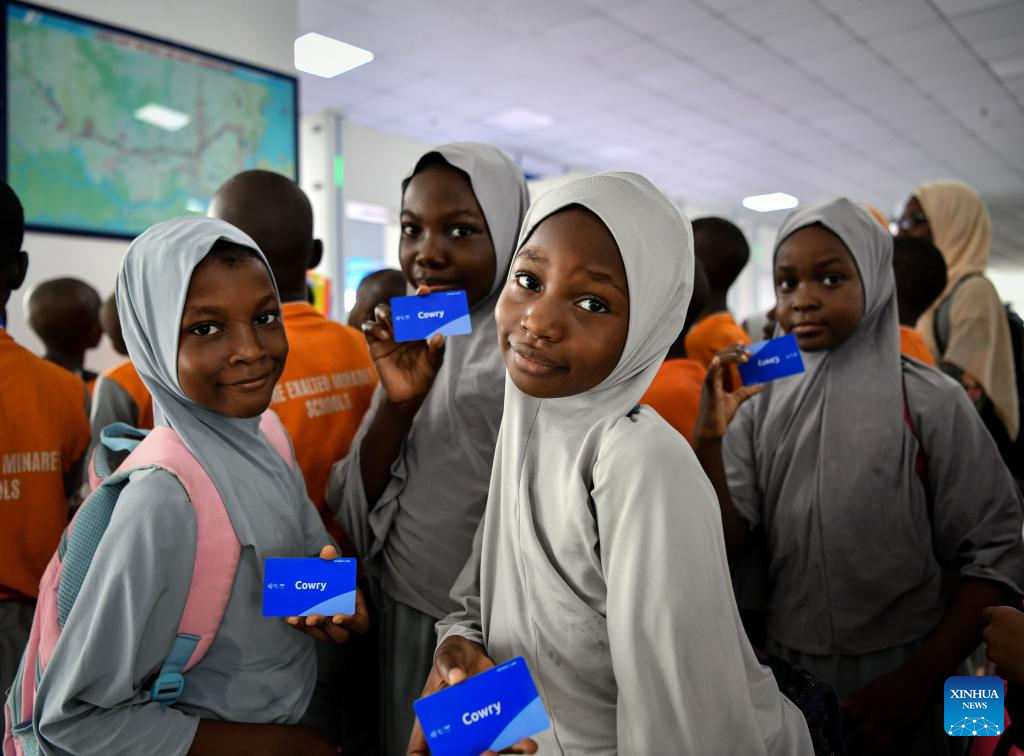 Students display the travel cards for the Lagos Rail Mass Transit (LRMT) Blue Line in Lagos, Nigeria, Feb. 28, 2024. Undertaken by China Civil Engineering Construction Corporation (CCECC) in July 2010 and completed in Dec. 2022, the first phase of the Lagos Rail Mass Transit (LRMT) Blue Line corridor spans 13 km and covers five stations. It began commercial operation in Sept. of 2023. As a symbolic project of the Belt and Road Initiative, the Blue Line project is the first electrified railroad and cross-sea light rail project in West Africa. (Xinhua/Han Xu)