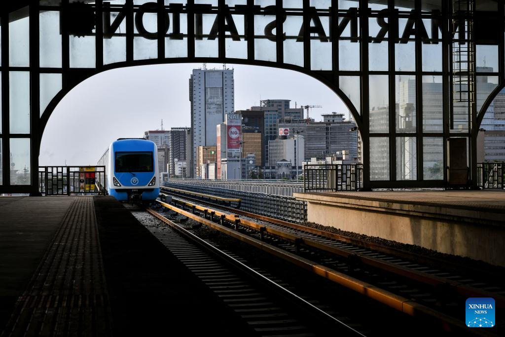 A drone photo taken on March 4, 2024 shows a train of the Lagos Rail Mass Transit (LRMT) Blue Line pulling in the Marina Station in Lagos, Nigeria. Undertaken by China Civil Engineering Construction Corporation (CCECC) in July 2010 and completed in Dec. 2022, the first phase of the Lagos Rail Mass Transit (LRMT) Blue Line corridor spans 13 km and covers five stations. It began commercial operation in Sept. of 2023. As a symbolic project of the Belt and Road Initiative, the Blue Line project is the first electrified railroad and cross-sea light rail project in West Africa. (Xinhua/Han Xu)