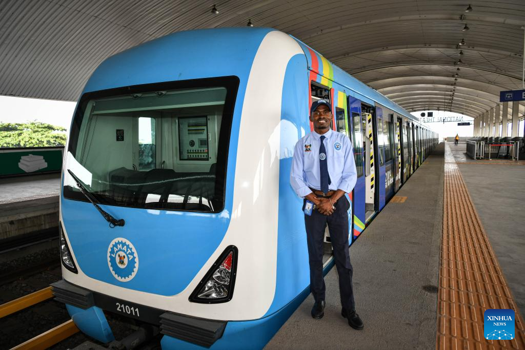 A local driver is pictured beside a train of the Lagos Rail Mass Transit (LRMT) Blue Line in Lagos, Nigeria, March 2, 2024. Undertaken by China Civil Engineering Construction Corporation (CCECC) in July 2010 and completed in Dec. 2022, the first phase of the Lagos Rail Mass Transit (LRMT) Blue Line corridor spans 13 km and covers five stations. It began commercial operation in Sept. of 2023. As a symbolic project of the Belt and Road Initiative, the Blue Line project is the first electrified railroad and cross-sea light rail project in West Africa. (Xinhua/Han Xu)