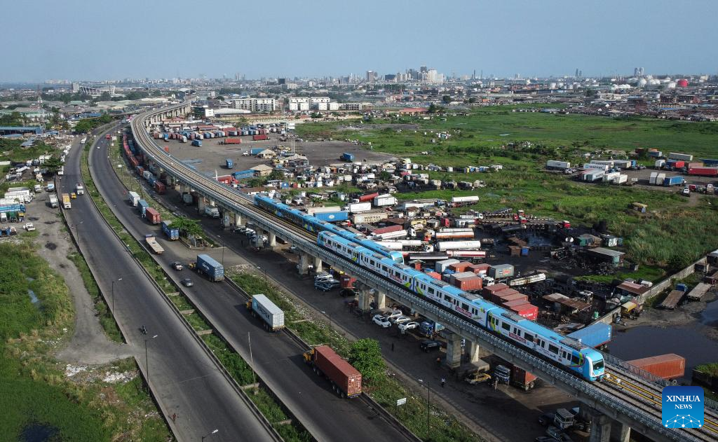 An aerial drone photo taken on March 4, 2024 shows trains running on the Lagos Rail Mass Transit (LRMT) Blue Line in Lagos, Nigeria. Undertaken by China Civil Engineering Construction Corporation (CCECC) in July 2010 and completed in Dec. 2022, the first phase of the Lagos Rail Mass Transit (LRMT) Blue Line corridor spans 13 km and covers five stations. It began commercial operation in Sept. of 2023. As a symbolic project of the Belt and Road Initiative, the Blue Line project is the first electrified railroad and cross-sea light rail project in West Africa. (Xinhua/Han Xu)