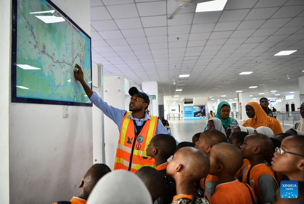 A staff member introduces the route schematic map of the Lagos Rail Mass Transit (LRMT) Blue Line to students in Lagos, Nigeria, Feb. 28, 2024. Undertaken by China Civil Engineering Construction Corporation (CCECC) in July 2010 and completed in Dec. 2022, the first phase of the Lagos Rail Mass Transit (LRMT) Blue Line corridor spans 13 km and covers five stations. It began commercial operation in Sept. of 2023. As a symbolic project of the Belt and Road Initiative, the Blue Line project is the first electrified railroad and cross-sea light rail project in West Africa. (Xinhua/Han Xu)