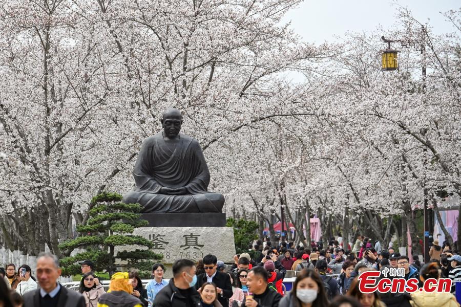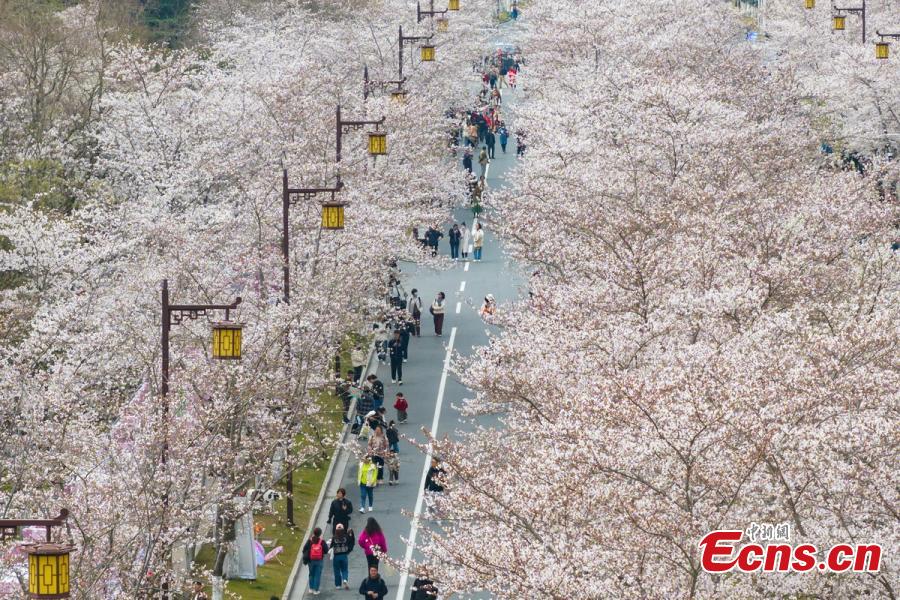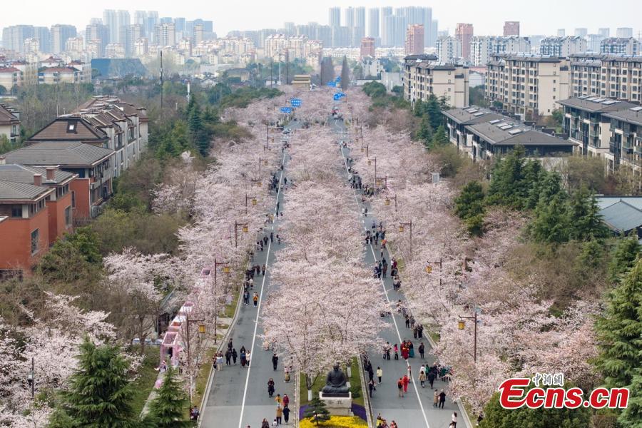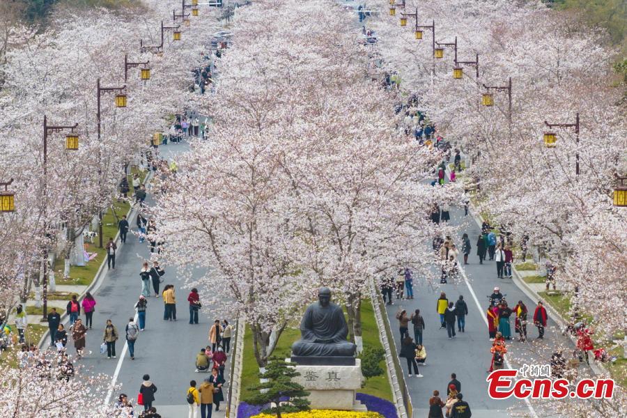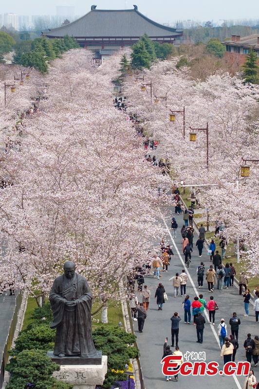 Jianzhen road is adorned with blooming cherry blossoms in Yangzhou, east China's Jiangsu Province, March 26, 2024. (Photo: China News Service/Yang Bo)