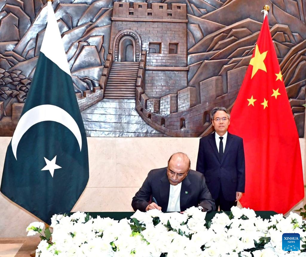Pakistani President Asif Ali Zardari writes a message of condolences at the Chinese Embassy in Islamabad, Pakistan, on March 27, 2024. Pakistani President Asif Ali Zardari on Wednesday expressed condolences to Chinese citizens killed in a terrorist attack while visiting the Chinese embassy in Pakistan. (PID/Handout via Xinhua)
