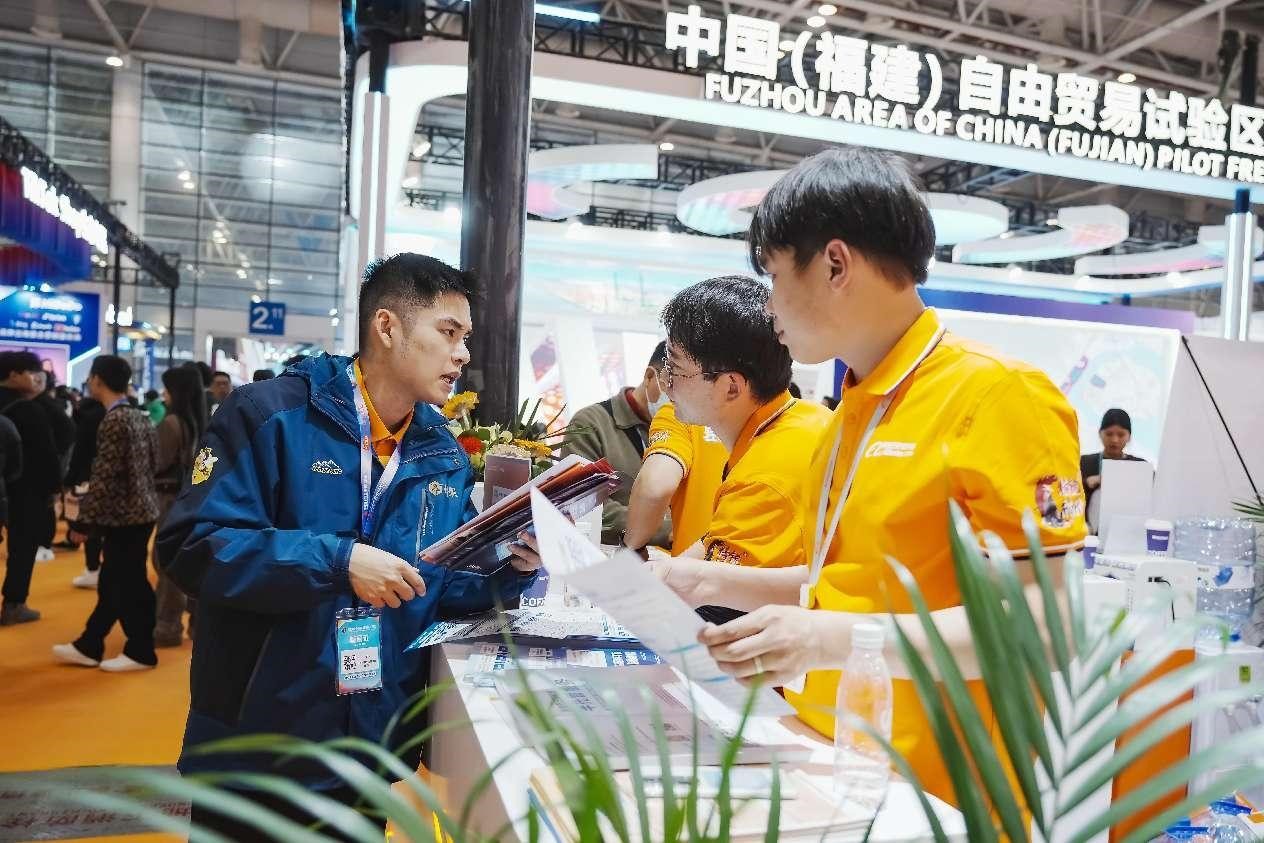 Staff members of an exhibitor at the 4th China Cross-border E-commerce Trade Fair in Fuzhou, southeast China's Fujian province talk to a visitor, March 18, 2024. (People's Daily Online/Xie Guiming)