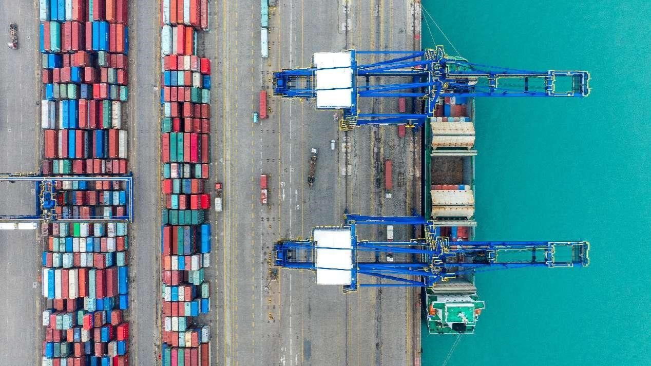 Photo taken on March 8, 2024 shows a busy scene of a container terminal in Haikou, south China's Hainan province. (People's Daily Online/Yang He)