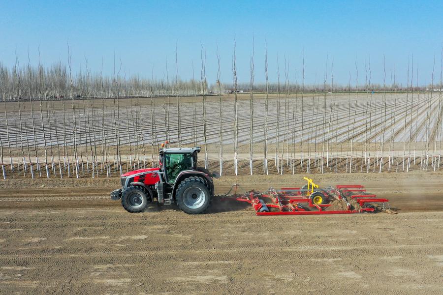 A drone photo shows a land grader working in the farmland in Awat County of Aksu, northwest China's Xinjiang Uygur Autonomous Region, March 26, 2024. (Xinhua/Ding Lei)