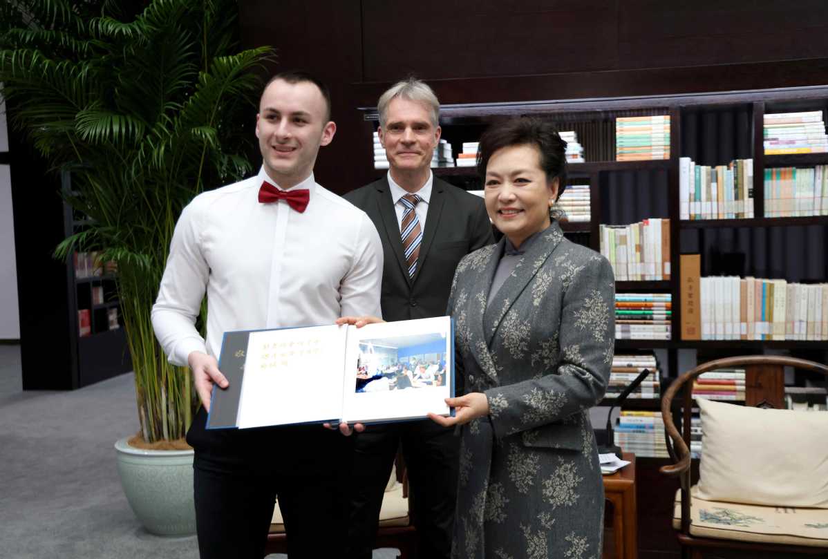 Olaf Millmann (middle), chairman of the Burg Chinese Chorus association, and a student representative (left) present Peng Liyuan with a commemorative photo album documenting the 10-year friendly relationship between Peng Liyuan and the choir, on March 28. [Photo by Wang Jing / China Daily]