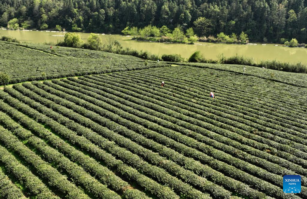 A drone photo shows farmers picking tea leaves at tea gardens in Ninghong Village in Xiushui County, east China's Jiangxi Province, March 28, 2024. Tea farmers and enterprises are busy harvesting and processing spring tea leaves to meet the consumer demand lately. (Xinhua/Wan Xiang)