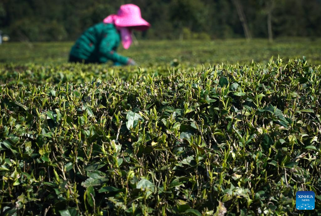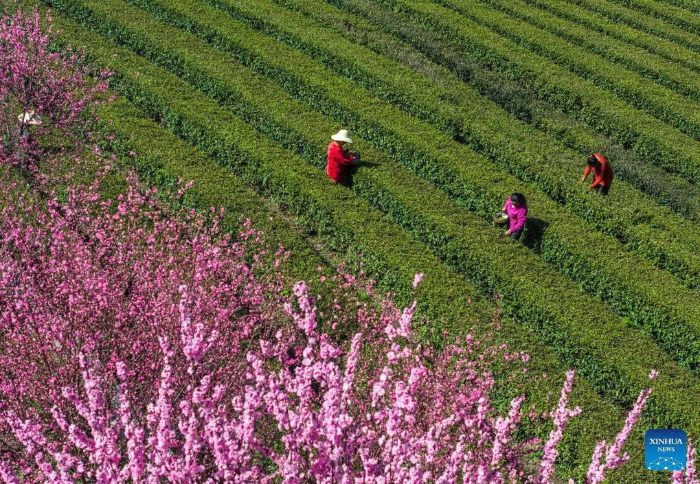 Farmers pick tea leaves at tea gardens in Ninghong Village in Xiushui County, east China's Jiangxi Province, March 28, 2024. Tea farmers and enterprises are busy harvesting and processing spring tea leaves to meet the consumer demand lately. (Xinhua/Wan Xiang)