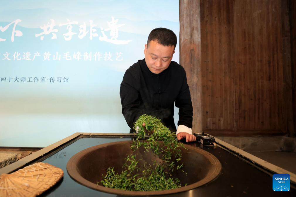 A man processes tea leaves in Fuxi Township in Huangshan City, east China's Anhui Province, March 28, 2024. Tea farmers and enterprises are busy harvesting and processing spring tea leaves to meet the consumer demand lately. (Photo by Fan Chengzhu/Xinhua)