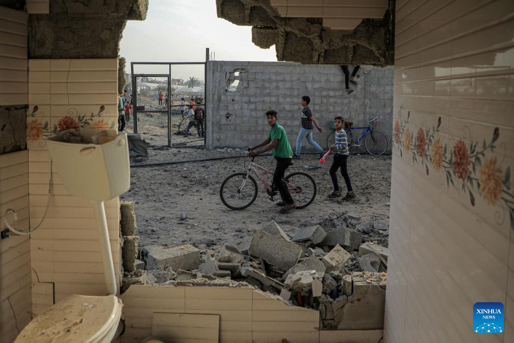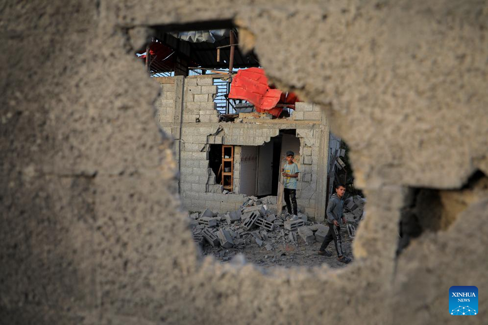 Children are seen among rubble after Israeli airstrikes in the southern Gaza Strip city of Rafah, on March 27, 2024. The Palestinian death toll in the Gaza Strip has risen to 32,552, the Hamas-run Health Ministry said in a press statement on Thursday. (Photo by Rizek Abdeljawad/Xinhua)
