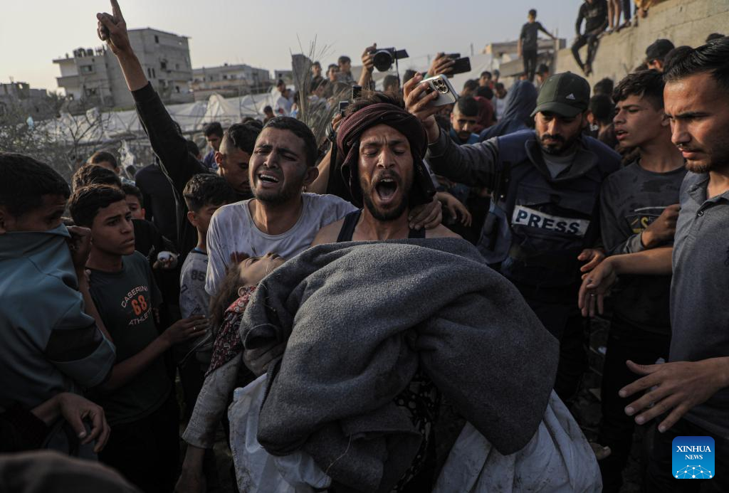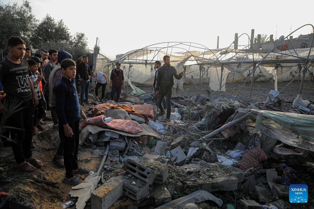 People look at the rubble after Israeli airstrikes in the southern Gaza Strip city of Rafah, on March 27, 2024. The Palestinian death toll in the Gaza Strip has risen to 32,552, the Hamas-run Health Ministry said in a press statement on Thursday. (Photo by Rizek Abdeljawad/Xinhua)