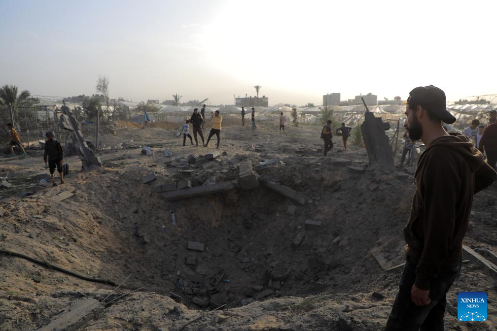 People look at a shell crater after Israeli airstrikes in the southern Gaza Strip city of Rafah, on March 27, 2024. The Palestinian death toll in the Gaza Strip has risen to 32,552, the Hamas-run Health Ministry said in a press statement on Thursday. (Photo by Rizek Abdeljawad/Xinhua)