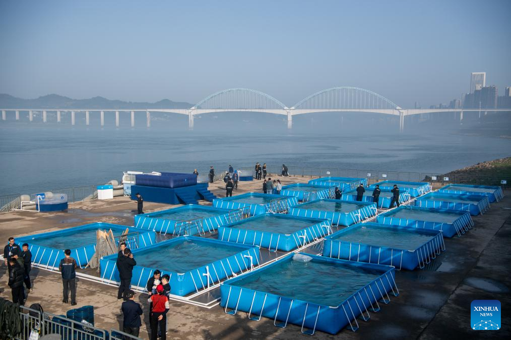 Staff members prepare to release Chinese sturgeons to the Yangtze River in Yichang, central China's Hubei Province, March 28, 2024. More than 200,000 second filial generation Chinese sturgeons were released into the Yangtze River on Thursday to increase wild stocks of the rare species. (Xinhua/Wu Zhizun)