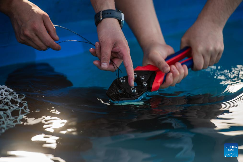 Staff members implant sonar emitters in Chinese sturgeons in Yichang, central China's Hubei Province, March 28, 2024. More than 200,000 second filial generation Chinese sturgeons were released into the Yangtze River on Thursday to increase wild stocks of the rare species. (Xinhua/Wu Zhizun)
