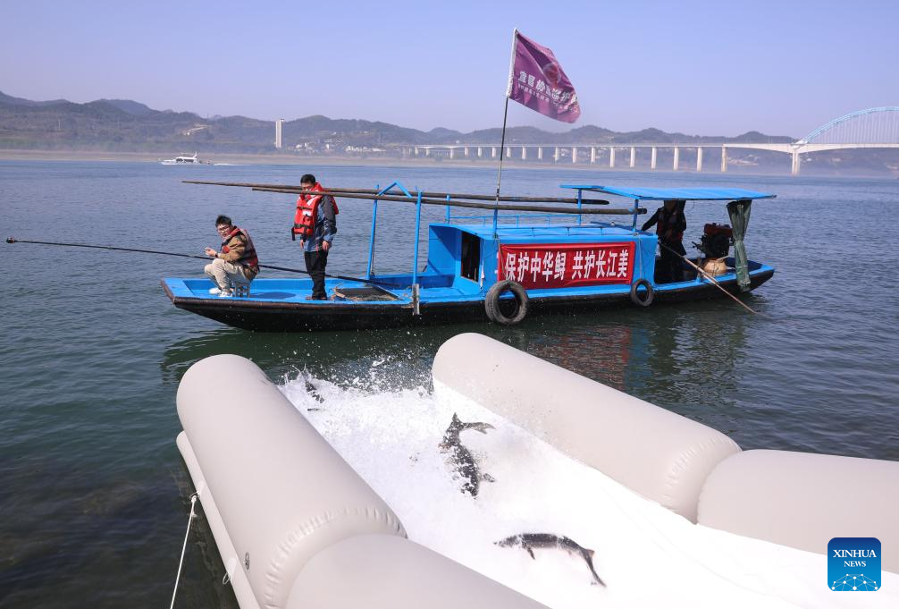 Chinese sturgeons are released to the Yangtze River in Yichang, central China's Hubei Province, March 28, 2024. More than 200,000 second filial generation Chinese sturgeons were released into the Yangtze River on Thursday to increase wild stocks of the rare species. (Photo by Zheng Jiayu/Xinhua)