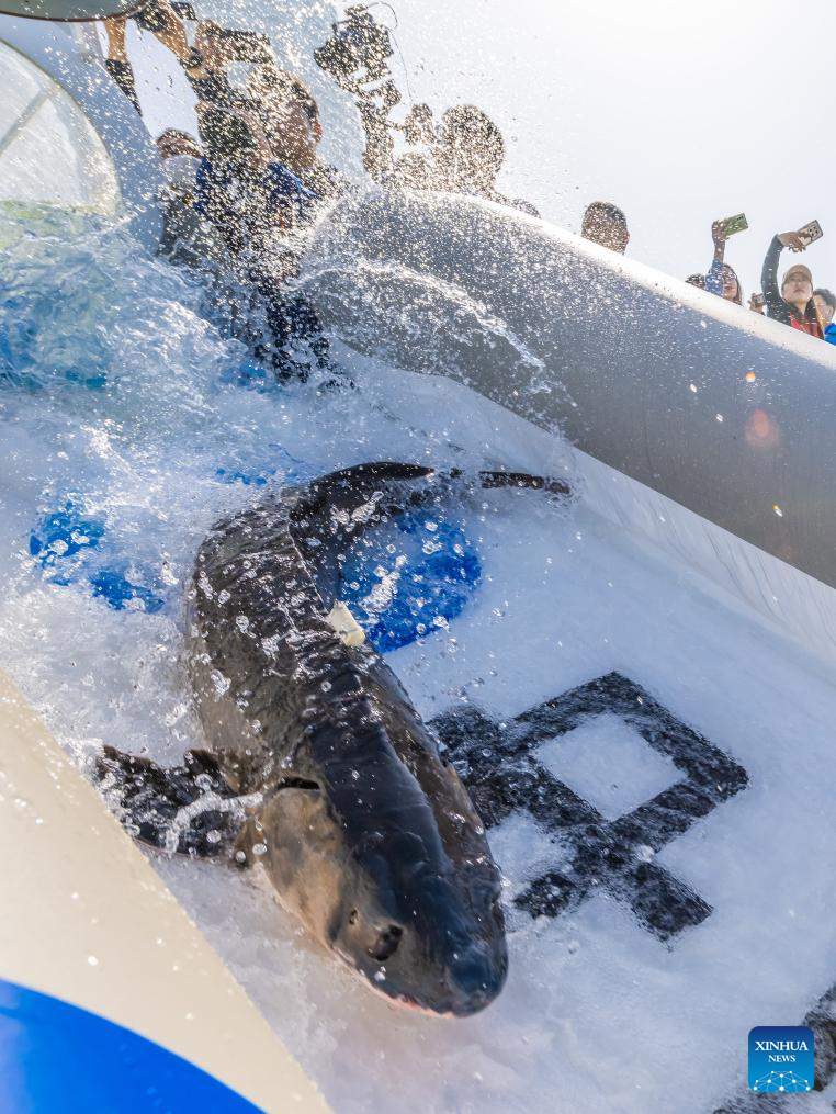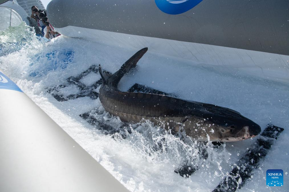 A Chinese sturgeon is released to the Yangtze River in Yichang, central China's Hubei Province, March 28, 2024. More than 200,000 second filial generation Chinese sturgeons were released into the Yangtze River on Thursday to increase wild stocks of the rare species. (Xinhua/Wu Zhizun)