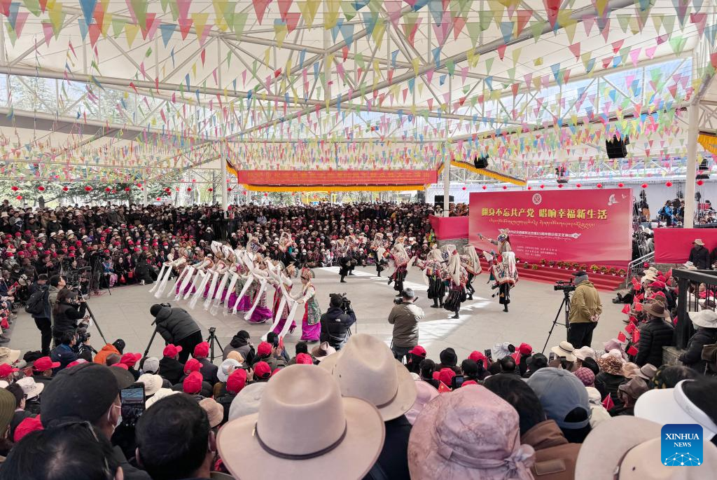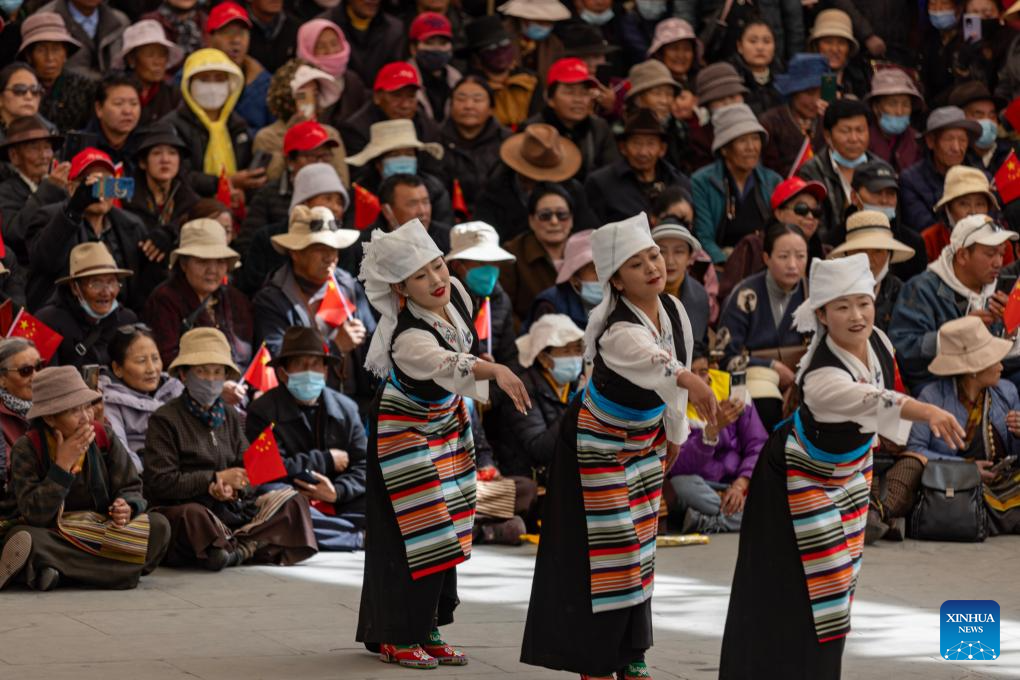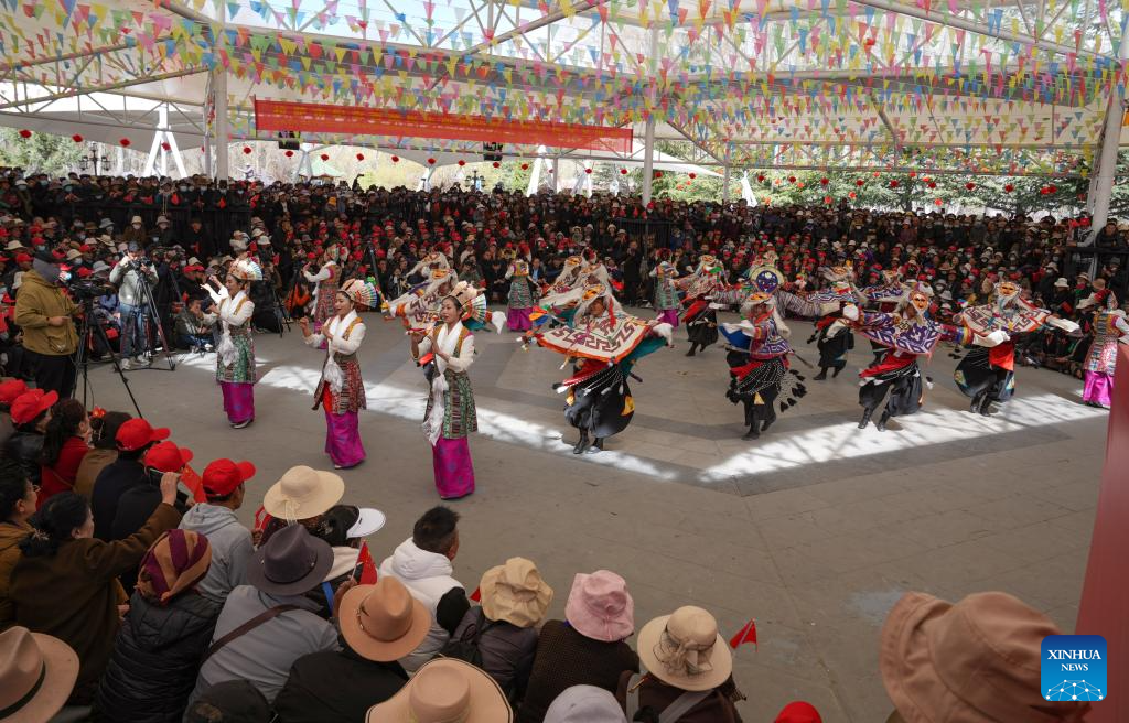 People watch a performance at a park to celebrate the Serfs' Emancipation Day in Lhasa, capital of southwest China's Xizang Autonomous Region, March 28, 2024. On March 28, 1959, people in Xizang launched the democratic reform, freeing a million serfs. In 2009, the regional legislature announced March 28 as the day to commemorate the emancipation of the one million serfs. (Xinhua/Jiang Fan)