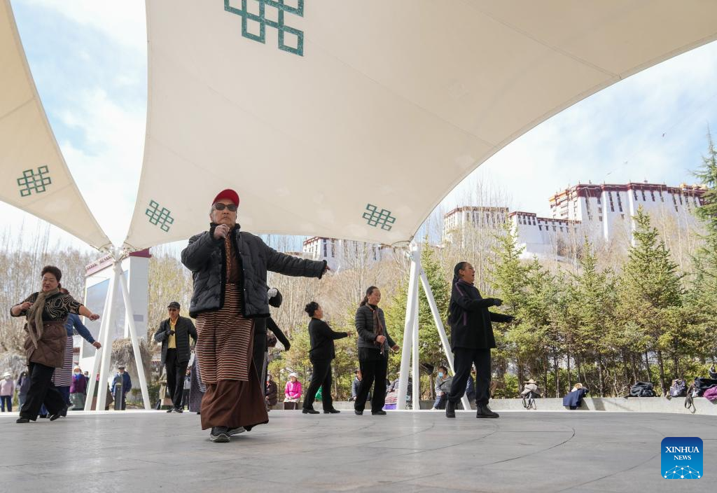 People dance at a park to celebrate the Serfs' Emancipation Day in Lhasa, capital of southwest China's Xizang Autonomous Region, March 28, 2024. On March 28, 1959, people in Xizang launched the democratic reform, freeing a million serfs. In 2009, the regional legislature announced March 28 as the day to commemorate the emancipation of the one million serfs. (Xinhua/Ding Ting)