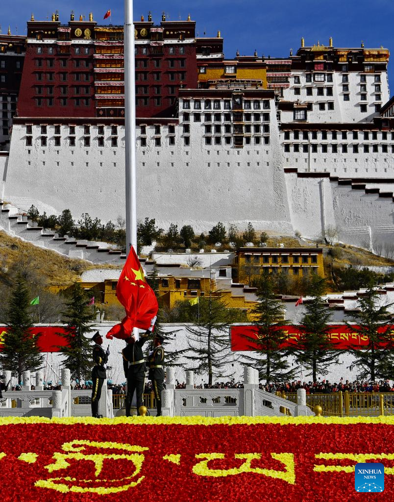 A flag-raising ceremony is held to celebrate the Serfs' Emancipation Day at the square in front of the Potala Palace in Lhasa, capital of southwest China's Xizang Autonomous Region, March 28, 2024. On March 28, 1959, people in Xizang launched the democratic reform, freeing a million serfs. In 2009, the regional legislature announced March 28 as the day to commemorate the emancipation of the one million serfs. (Xinhua/Zhang Rufeng)