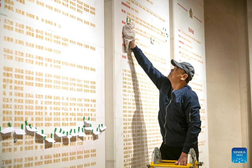 A staff member wipes the memorial wall of martyrs at the Peking-Tianjin Campaign Memorial Museum in north China's Tianjin Municipality, March 29, 2024. The Peking-Tianjin Campaign Memorial Museum held a name engraving ceremony for 29 martyrs whose native places and names were newly confirmed, which was the largest name engraving ceremony for martyrs in the museum in nearly 20 years. At present, 6,879 martyrs have their names engraved on the memorial wall of martyrs in the museum. (Xinhua/Sun Fanyue)