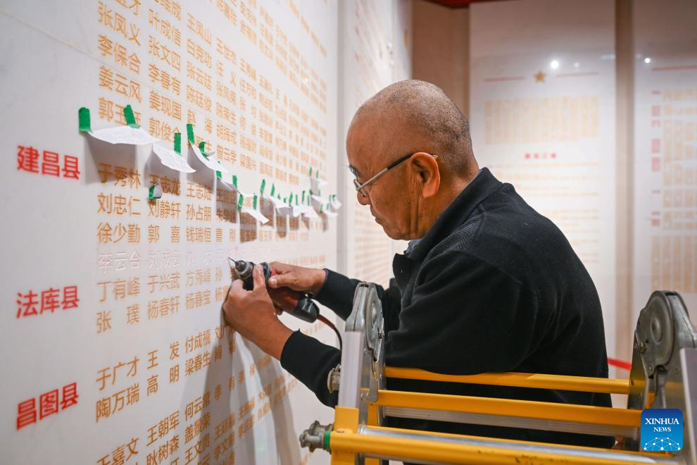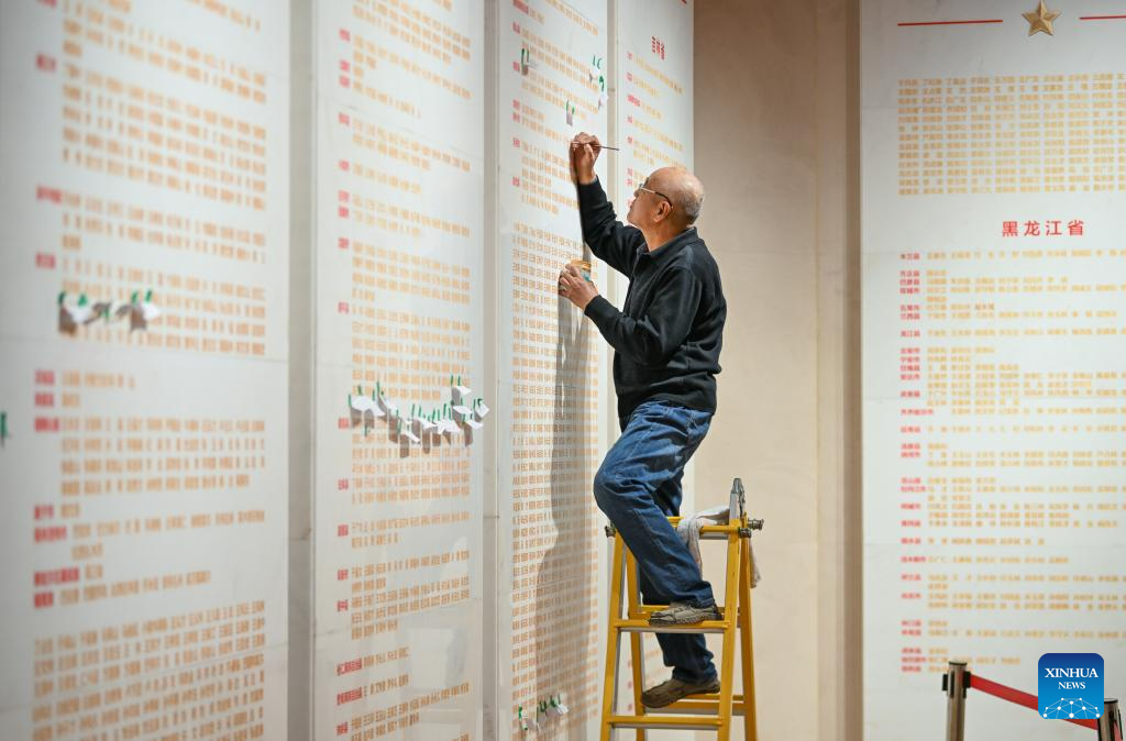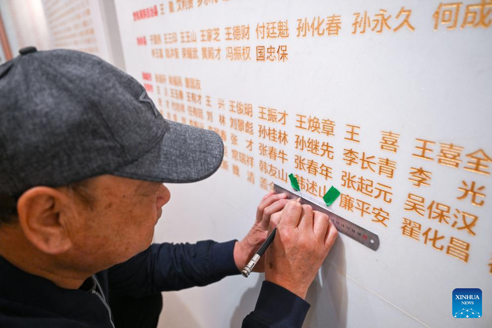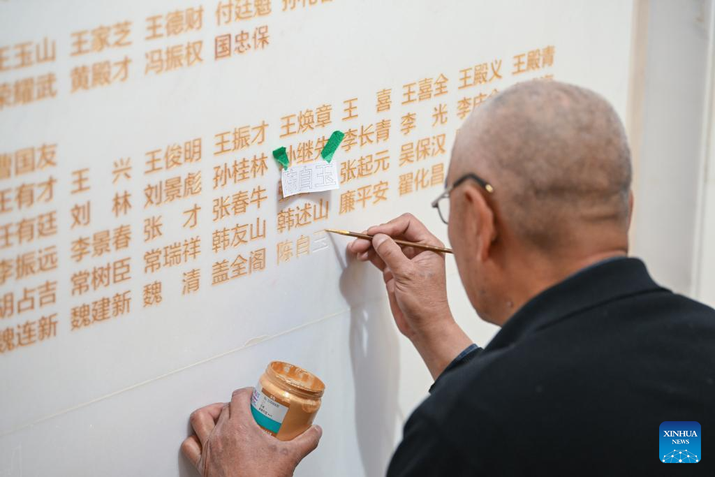 A staff member traces the names of newly confirmed martyrs with gold color at the Peking-Tianjin Campaign Memorial Museum in north China's Tianjin Municipality, March 29, 2024. The Peking-Tianjin Campaign Memorial Museum held a name engraving ceremony for 29 martyrs whose native places and names were newly confirmed, which was the largest name engraving ceremony for martyrs in the museum in nearly 20 years. At present, 6,879 martyrs have their names engraved on the memorial wall of martyrs in the museum. (Xinhua/Sun Fanyue)