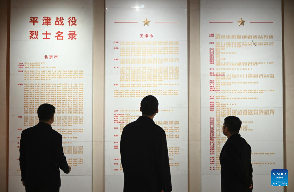 People stand in front of the memorial wall of martyrs at the Peking-Tianjin Campaign Memorial Museum in north China's Tianjin Municipality, March 29, 2024. The Peking-Tianjin Campaign Memorial Museum held a name engraving ceremony for 29 martyrs whose native places and names were newly confirmed, which was the largest name engraving ceremony for martyrs in the museum in nearly 20 years. At present, 6,879 martyrs have their names engraved on the memorial wall of martyrs in the museum. (Xinhua/Sun Fanyue)