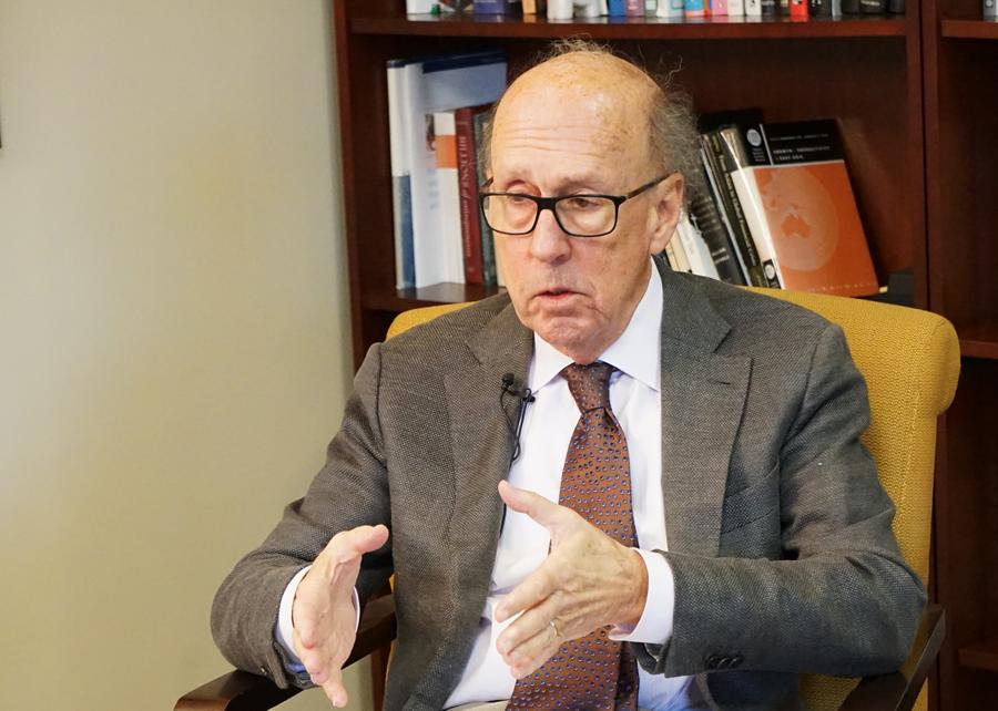Stephen Roach speaks during an interview with Xinhua in New Haven, the United States, Feb. 6, 2020. (Xinhua/Xu Yuan)
