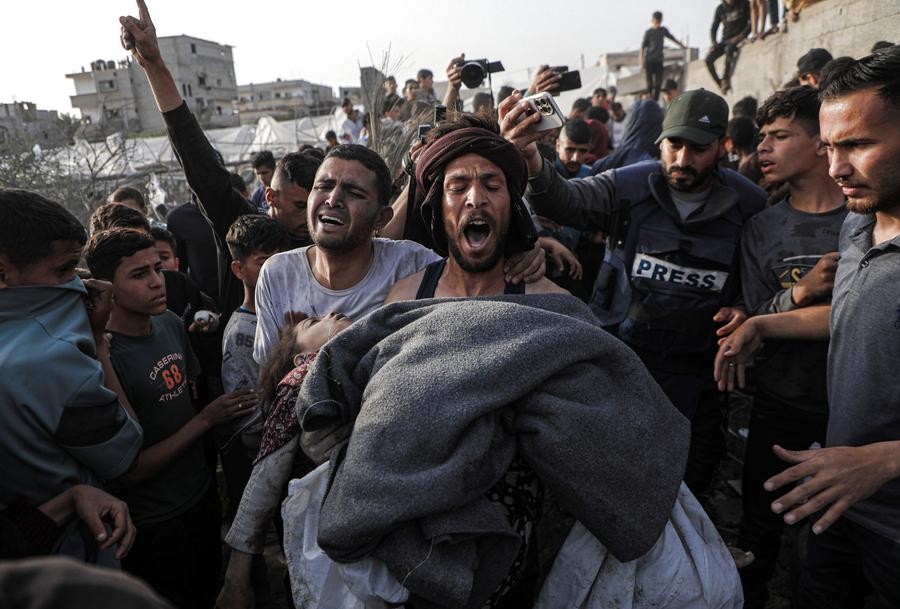 People wait to receive food relief in the southern Gaza Strip city of Rafah on March 30, 2024. (Photo by Rizek Abdeljawad/Xinhua)