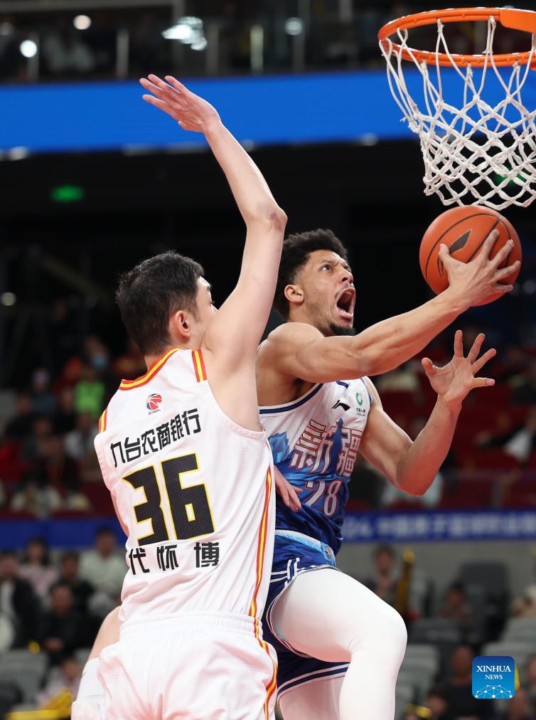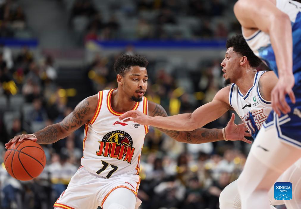 Dominique Jones (L) of Xinjiang Flying Tigers competes during the 50th round match between Jilin Northeast Tigers and Xinjiang Flying Tigers at the 2023-2024 season of the Chinese Basketball Association (CBA) league in Urumqi, northwest China's Xinjiang Uygur Autonomous Region, March 31, 2023. (Xinhua/Hu Huhu)