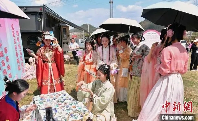 Photo shows girls dressed up in Hanfu in some cultural activities held after the Yongle Taohuapao Marathon in Yongle township, Nanming district, Guiyang city, capital of southwest China's Guizhou Province. (Photo courtesy of the media convergence center of Nanming district)