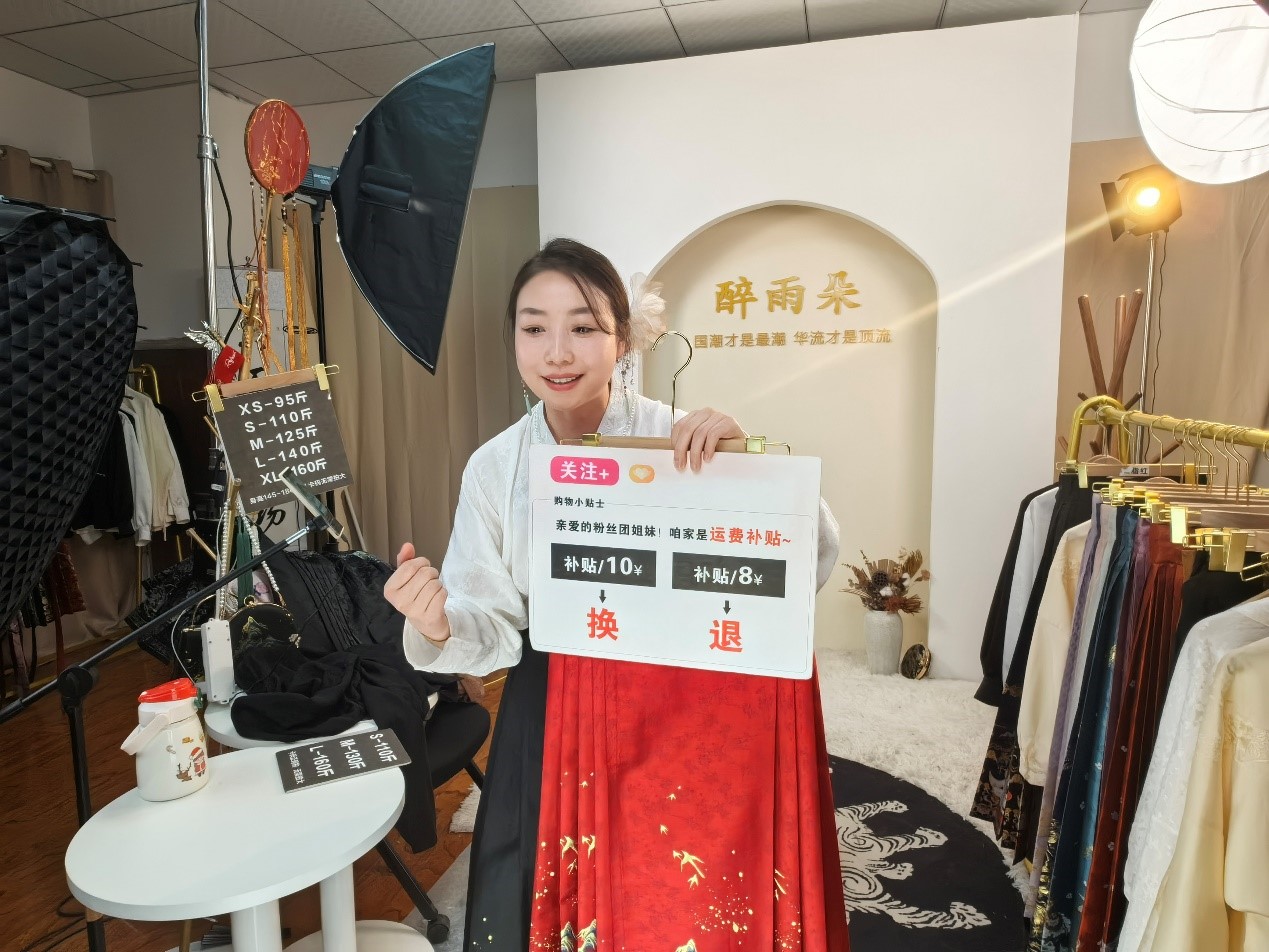 "The industrial network in Caoxian county used to be fragmented and lacked refinement," said Yao Chixing, general manager of an original Hanfu brand. In 2023, Yao and her husband established a Hanfu production hub covering 130 mu (8.66 hectares) centered on e-commerce, aiming to consolidate resources and develop a complete industrial chain.