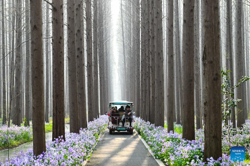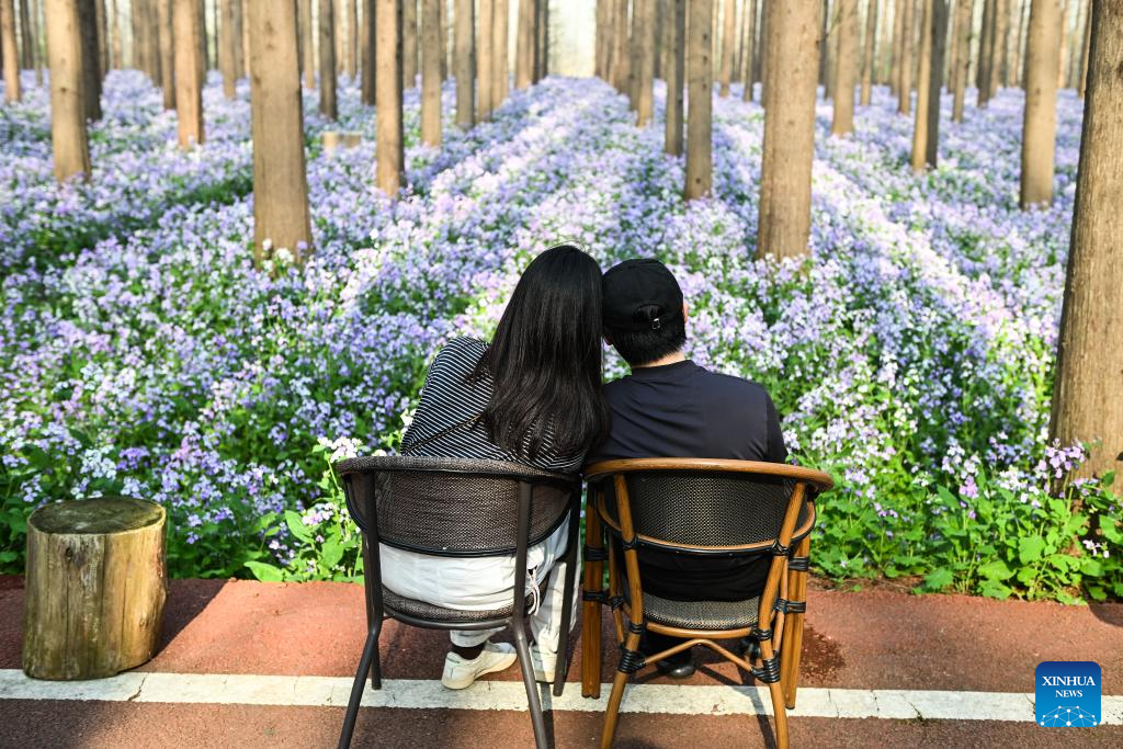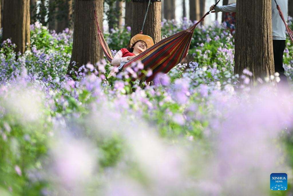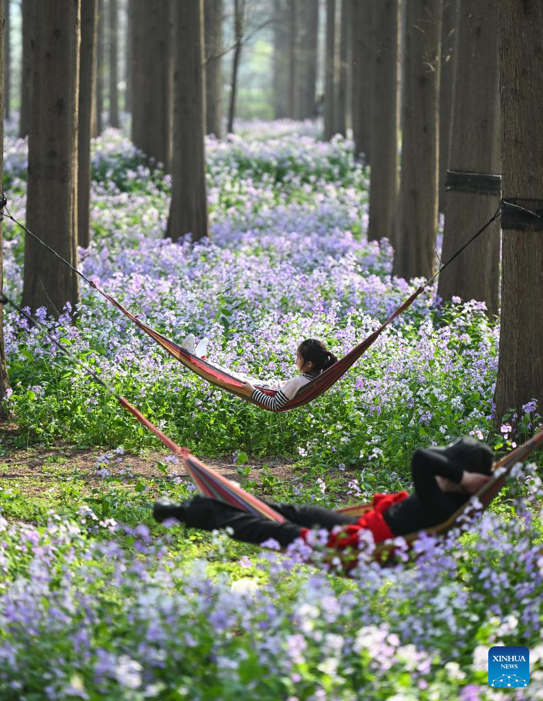Tourists relax amid flowers at Jinhu water forest scenic spot in Jinhu County, east China's Jiangsu Province, March 30, 2024. (Xinhua/Ji Chunpeng)