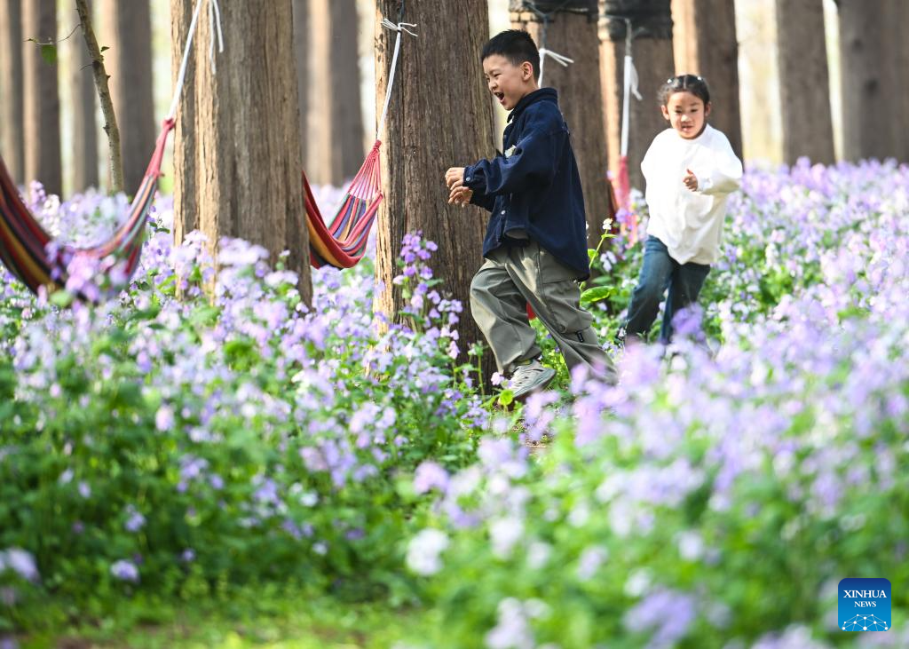 Children play amid flowers at Jinhu water forest scenic spot in Jinhu County, east China's Jiangsu Province, March 30, 2024. (Xinhua/Ji Chunpeng)