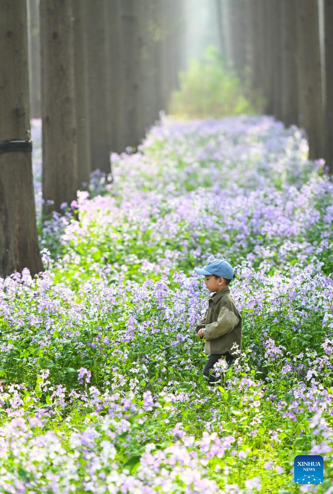 A child walks amid flowers at Jinhu water forest scenic spot in Jinhu County, east China's Jiangsu Province, March 30, 2024. (Xinhua/Ji Chunpeng)