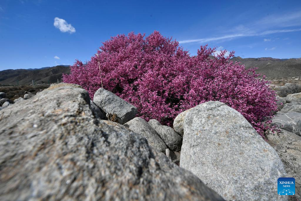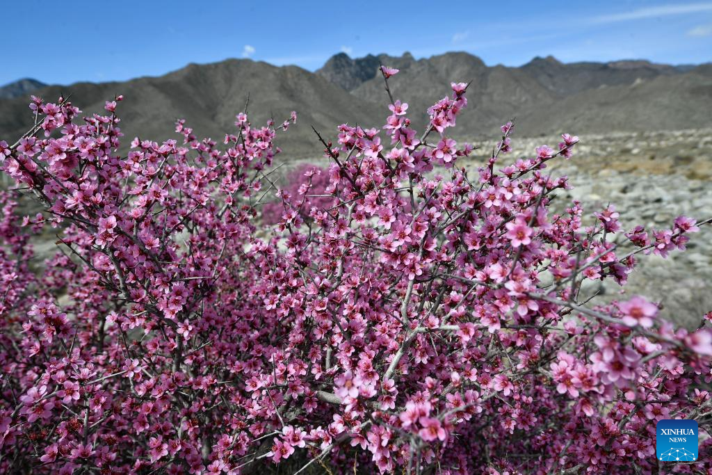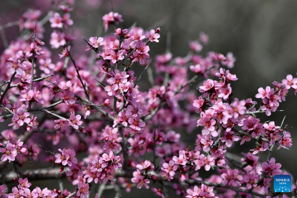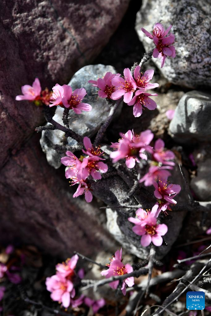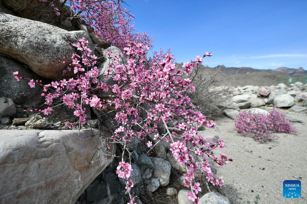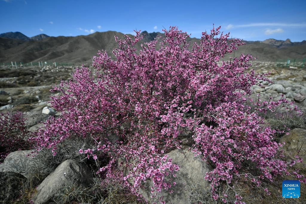 This photo taken on March 28, 2024 shows the blooming Mongolian almond at the eastern foot of the Helan Mountain in northwest China's Ningxia Hui Autonomous Region. The Mongolian almond is a kind of endangered plant which shows great tolerance to drought in the Gobi Desert area. (Xinhua/Wang Peng)