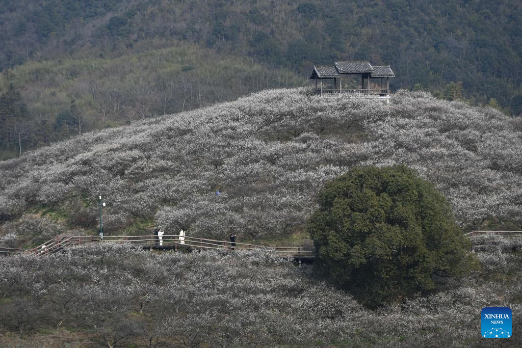 Tourists view plum blossoms at Yingzhou plum garden in Wuxing District of Huzhou, east China's Zhejiang Province, Feb. 27, 2024. (Xinhua/Huang Zongzhi)