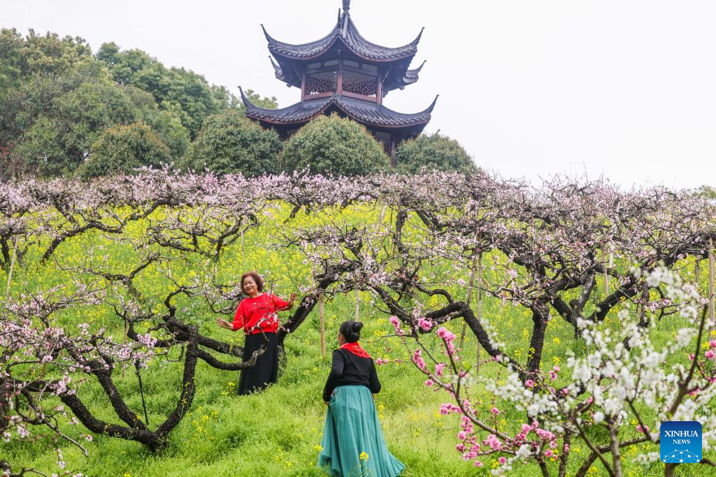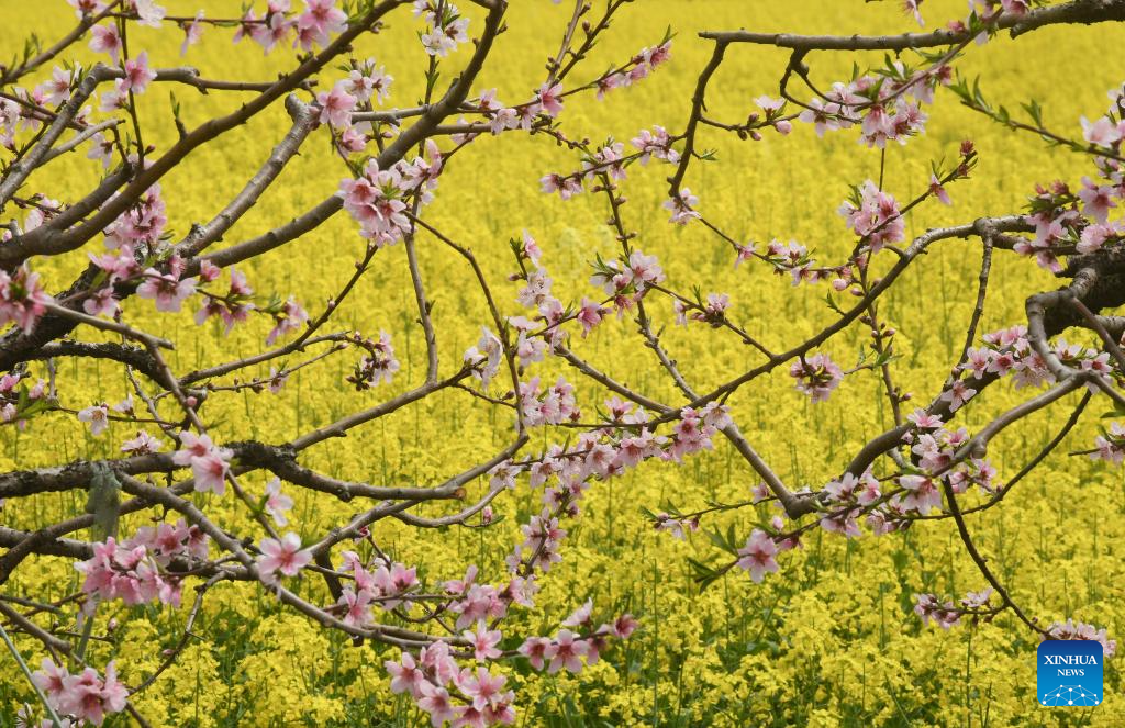 Blooming peach blossoms and cole flowers are pictured in Balidian Town of Wuxing District in Huzhou, east China's Zhejiang Province, March 30, 2024. (Xinhua/Weng Xinyang)