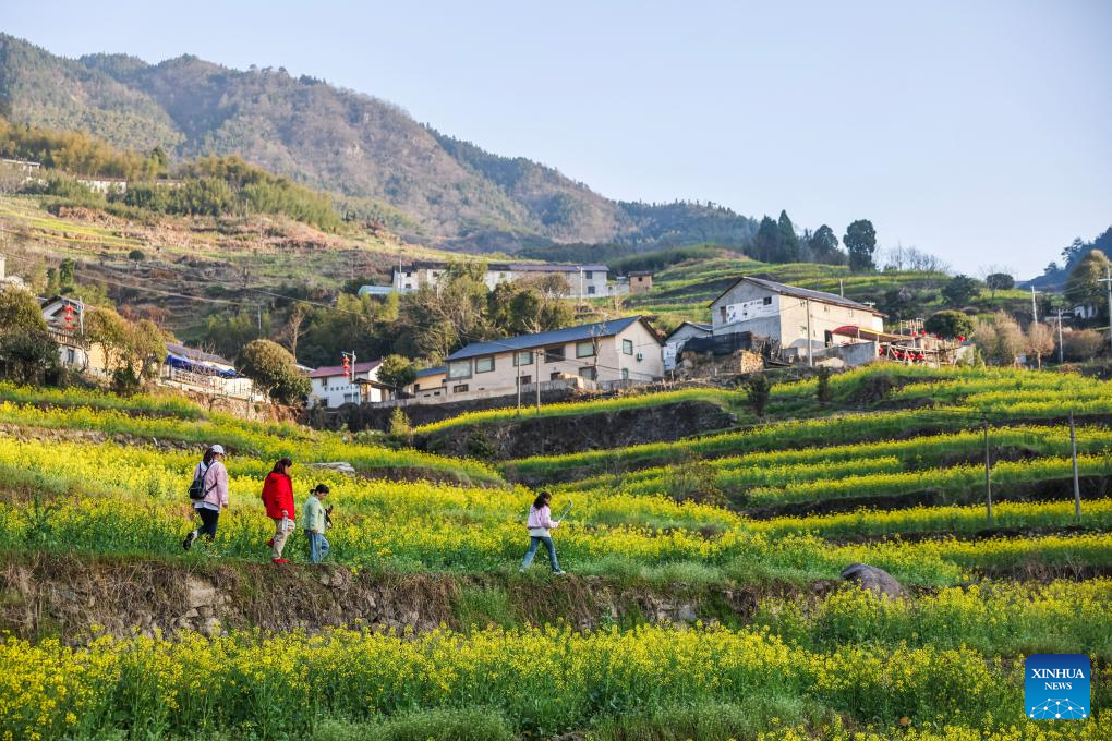 Tourists view cole flowers in a field in Qiantan Town of Jiande City, east China's Zhejiang Province, March 21, 2024. (Xinhua/Xu Yu)