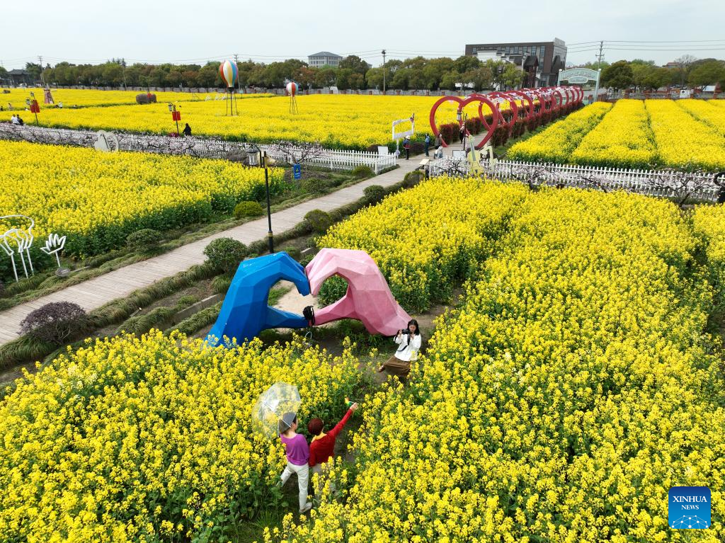 Tourists pose for photos amid blooming cole flowers in Balidian Town of Wuxing District in Huzhou, east China's Zhejiang Province, March 30, 2024. (Xinhua/Weng Xinyang)