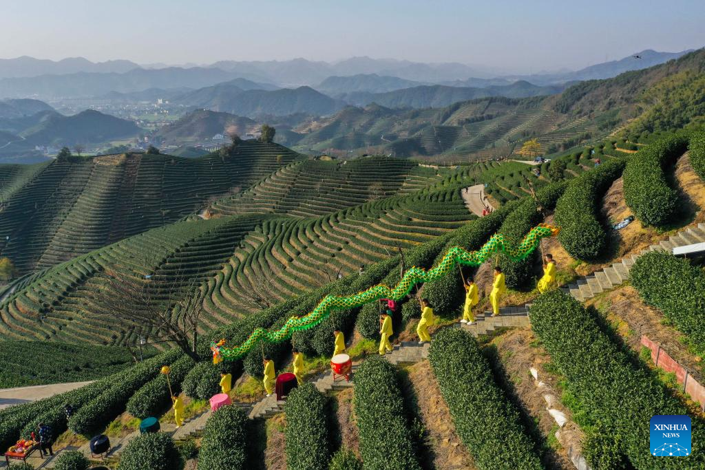 An aerial drone photo taken on March 20, 2024 shows villagers performing dragon dance to celebrate the harvest of spring tea leaves in Bashan Village of Fuyang District in Hangzhou, east China's Zhejiang Province. (Xinhua/Xu Yu)