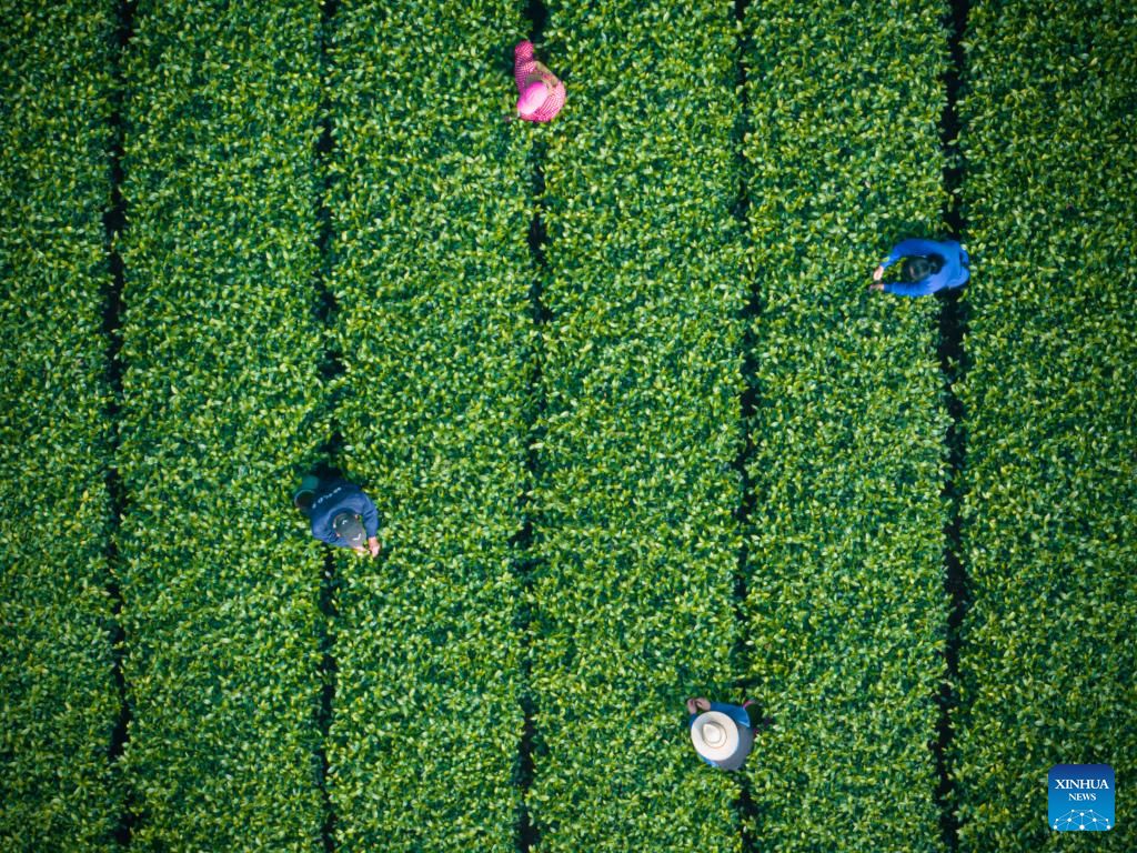 An aerial drone photo taken on March 27, 2024 shows farmers picking spring tea leaves at a tea garden on Gaoting Mountain in Shangcheng District of Hangzhou, east China's Zhejiang Province. (Xinhua/Jiang Han)