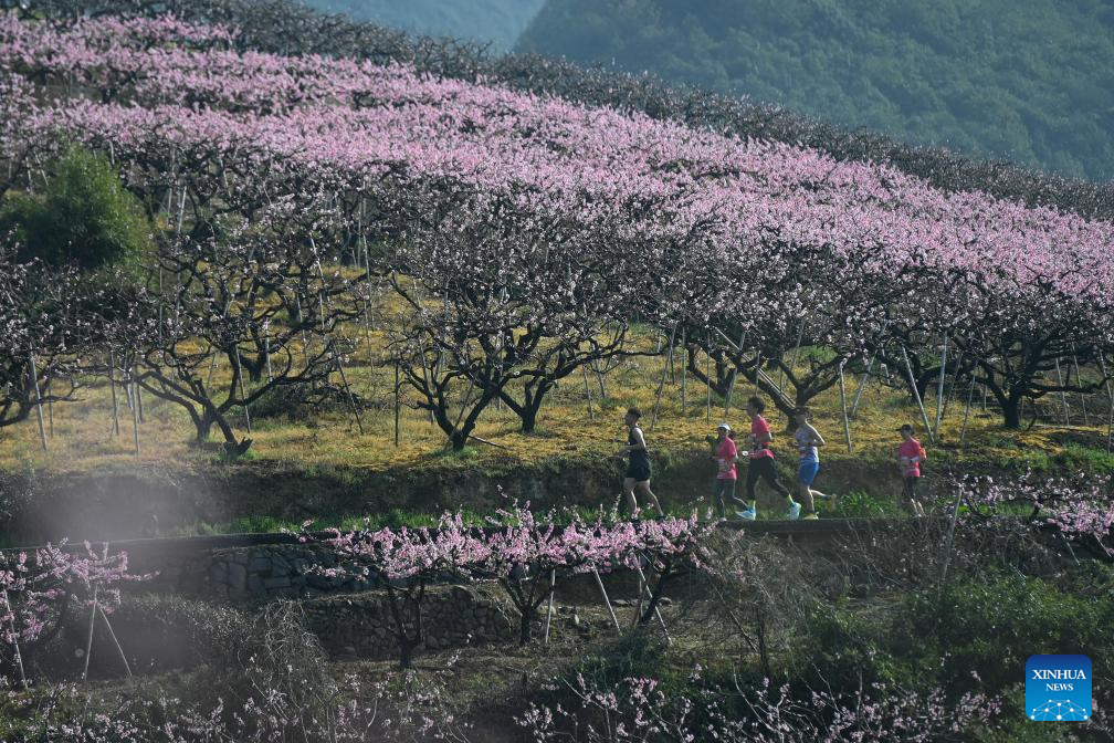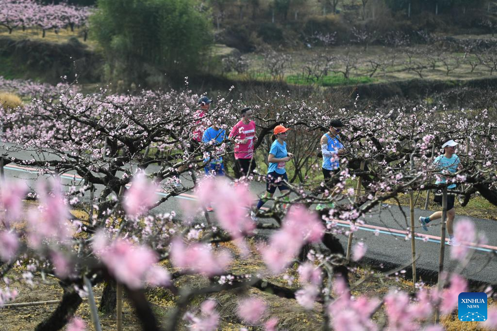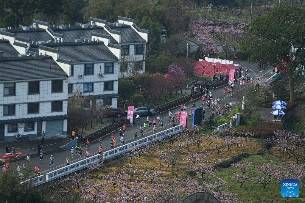 Marathon competitors run past peach gardens in Linjia Village of Fenghua District in Ningbo, east China's Zhejiang Province, March 24, 2024. (Xinhua/Huang Zongzhi)