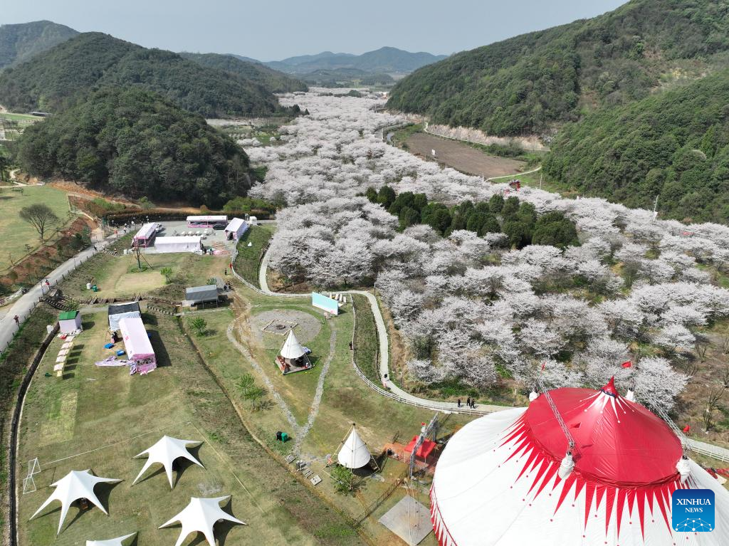 An aerial drone photo taken on March 27, 2024 shows tourists viewing cherry blossoms in Zhangzhen Town of Shangyu District in Shaoxing, east China's Zhejiang Province. (Xinhua/Weng Xinyang)